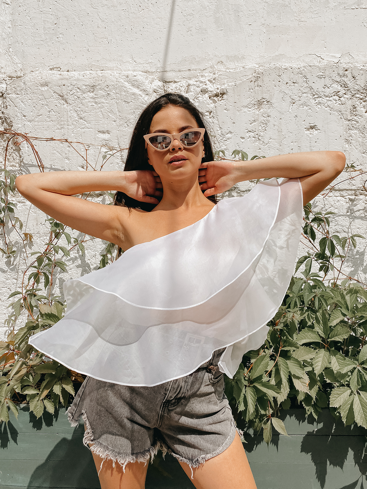 Асимметричный воздушный топ из 100% шелка поможет добавить летним аутфитам женственности и романтики. Крупные воланы на одно плечо красиво подчеркивают зону ключиц. Если добавить к топу простые джинсы и нарядные босоножки, получится эффектный образ «на выход», который всегда будет актуален.