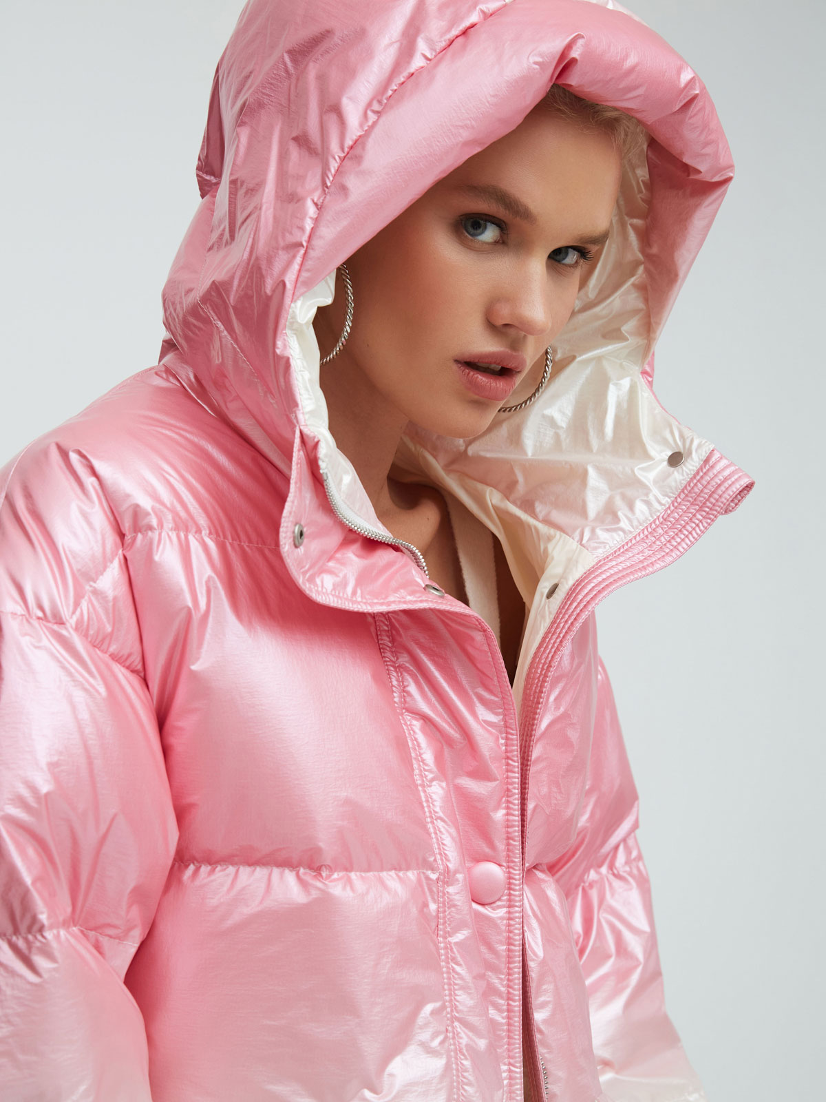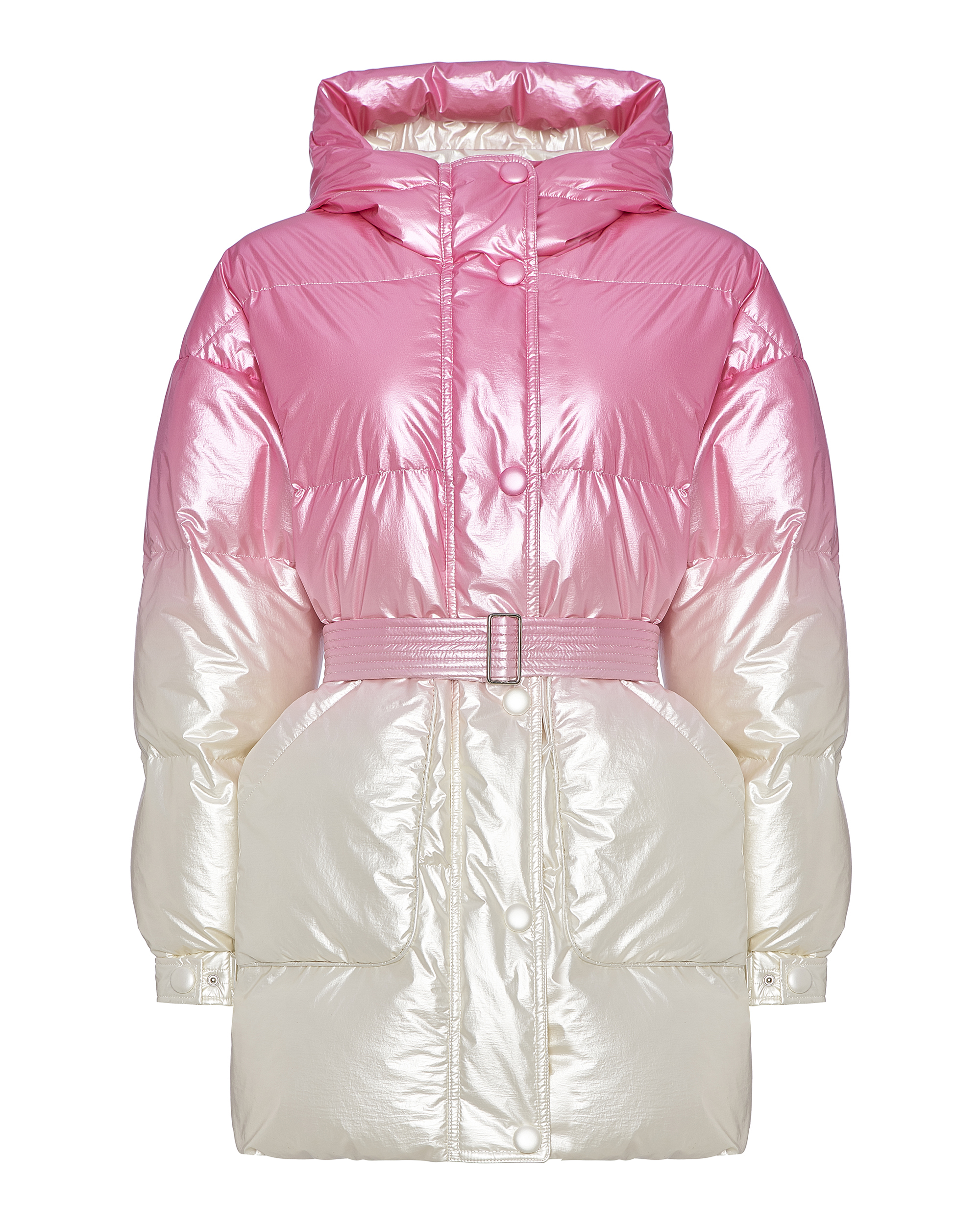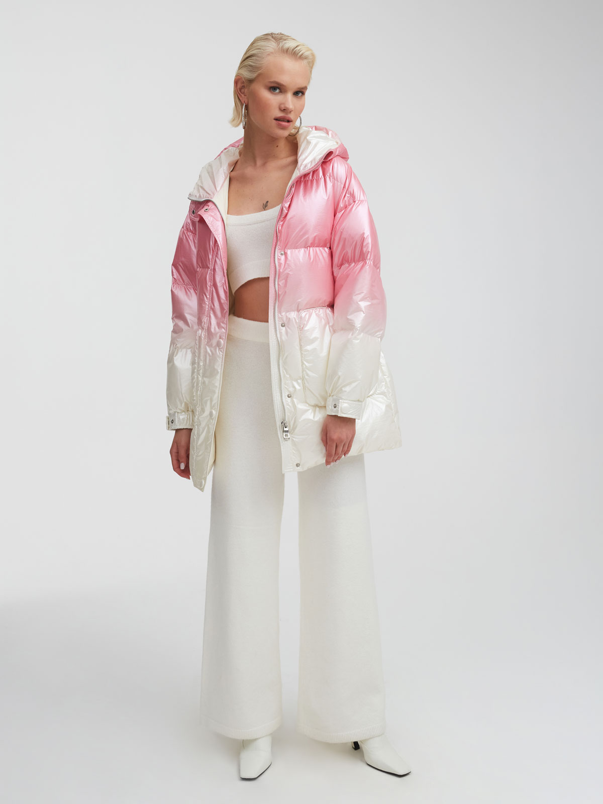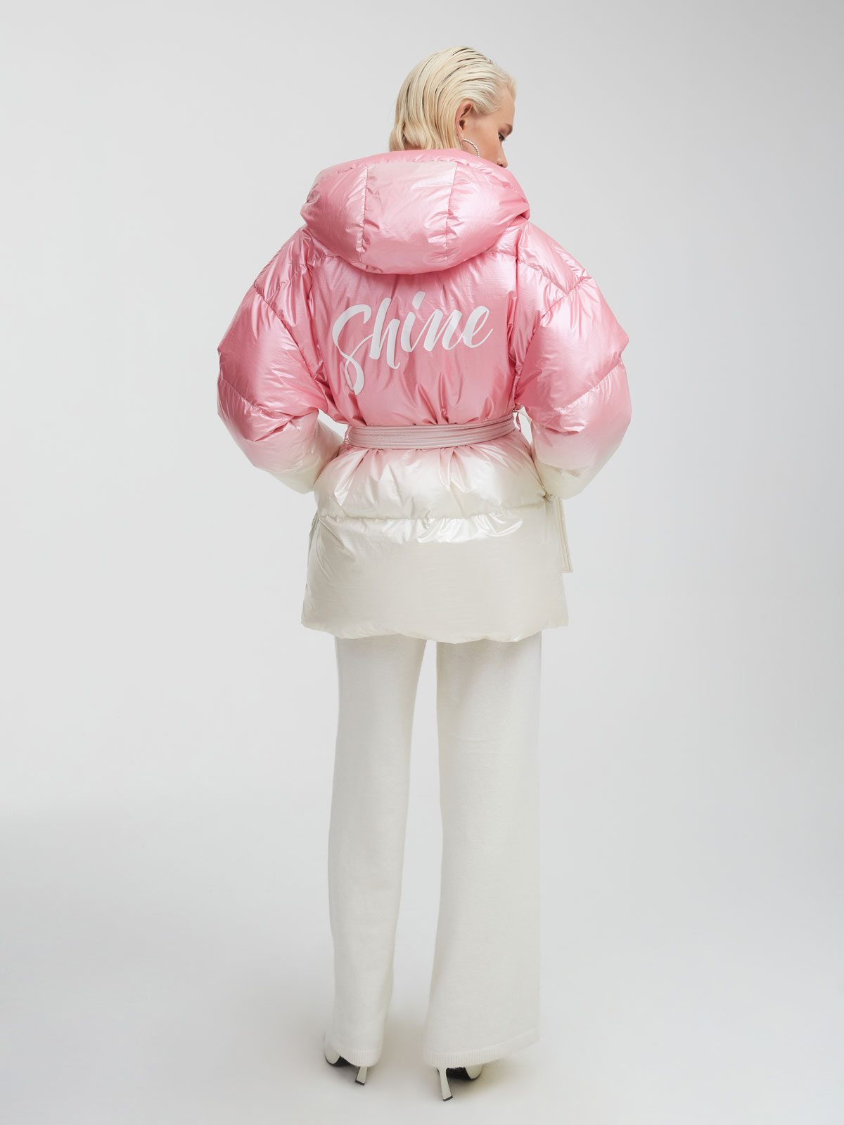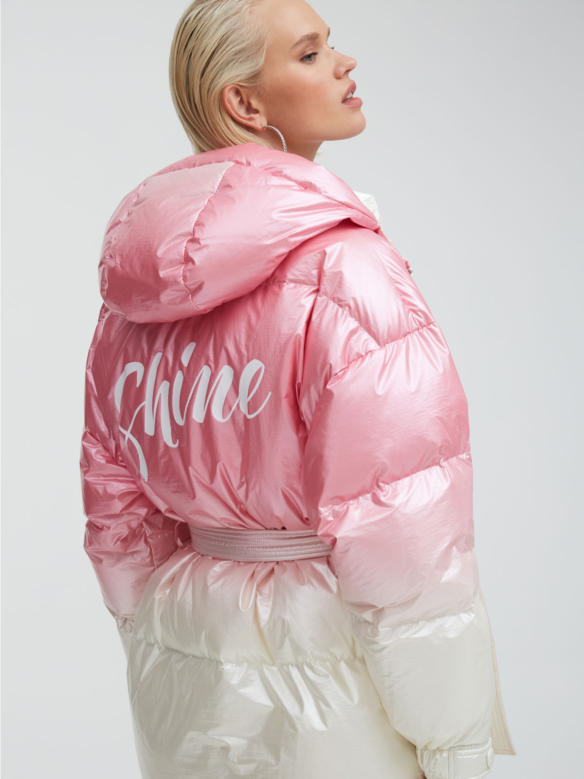 Пуховик с броской надписью на спине Shine объединяет в себе все самые горячие тенденции: пастельные оттенки, градиентный цветовой переход из нежно-розового в молочный, оверсайз-крой и красиво переливающуюся на солнце мерцающую текстуру.