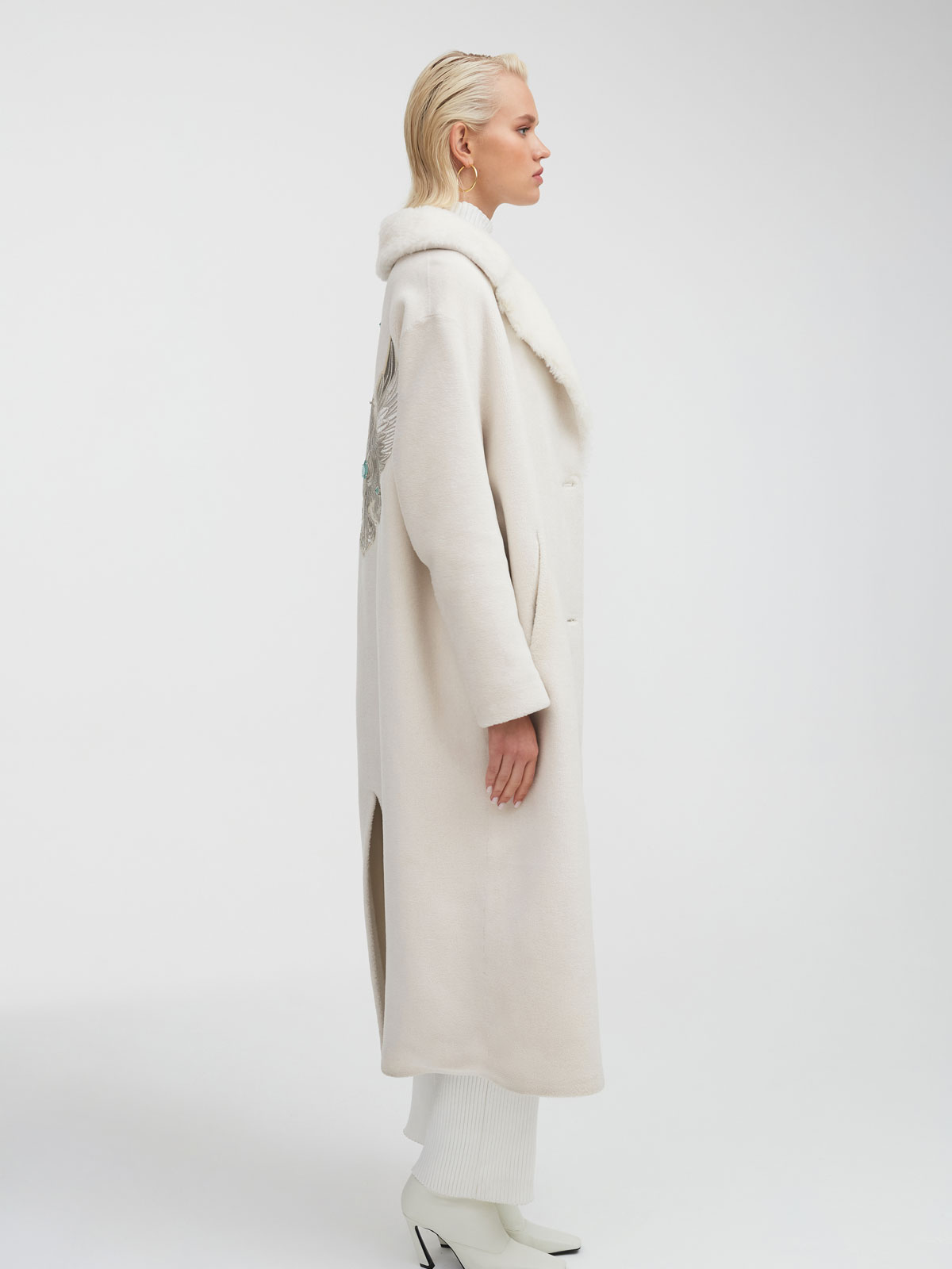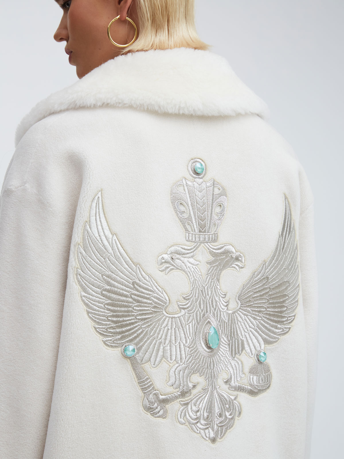 Самое изысканное и дорогое изделие в коллекции Mila MarseL x Axenoff – шуба из 100% шерсти с двуглавым орлом, вышитым нитями из белого золота. Это исключительное сочетание современных трендов, высоких технологий, эксклюзивного дизайна в русском стиле и исконно русских промыслов, которые воплотились в актуальной и свежей интерпретации.