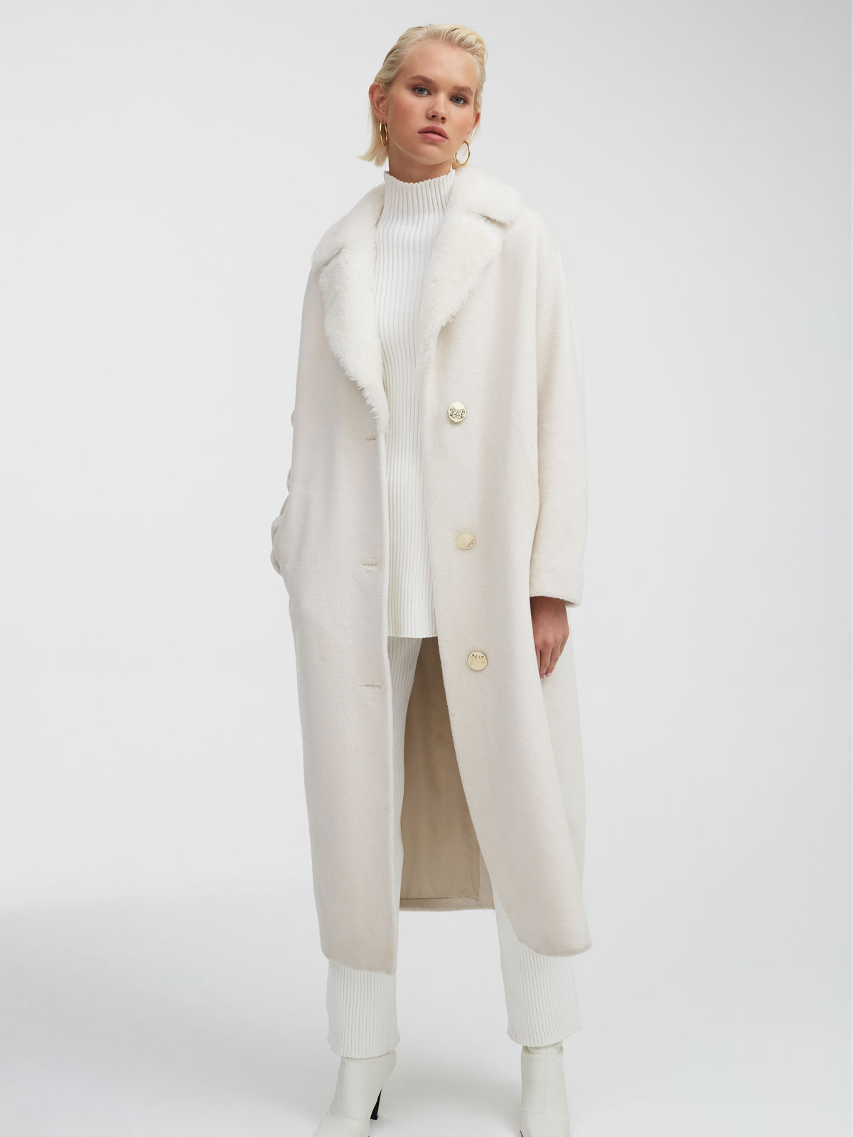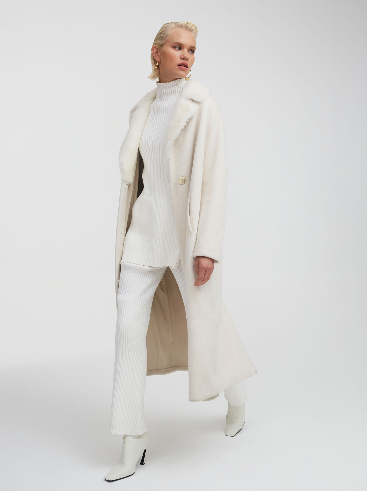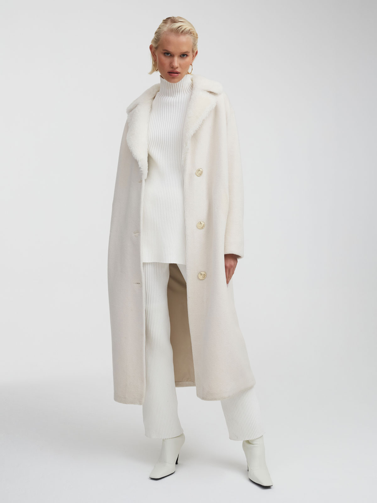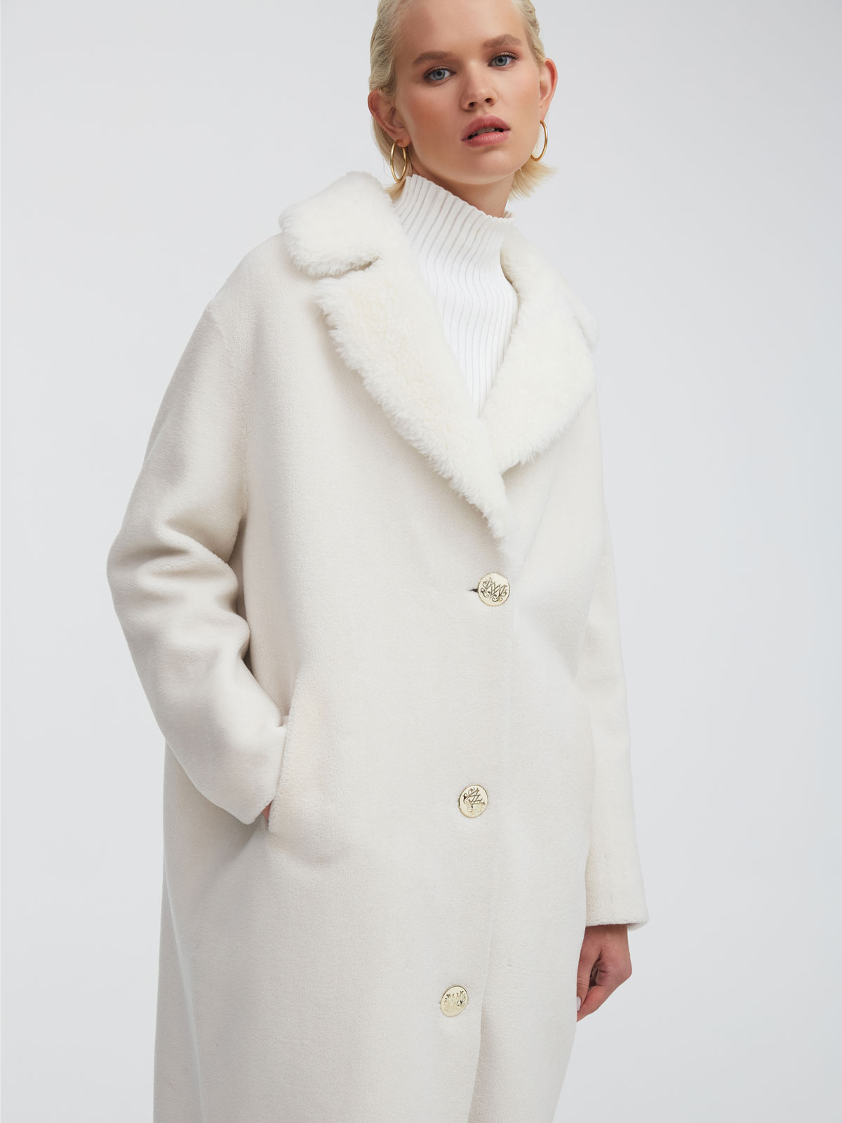 Русские традиции в этой модели идут рука об руку с инновационными технологиями: шуба из 100% шерсти – это специальная разработка бренда MILAMARSEL. По тепловым свойствам и внешнему виду она идентична натуральному меху, выдерживает температуру до -30 градусов, но при этом полностью экологична и отвечает глобальному тренду модной индустрии на устойчивое развитие.
