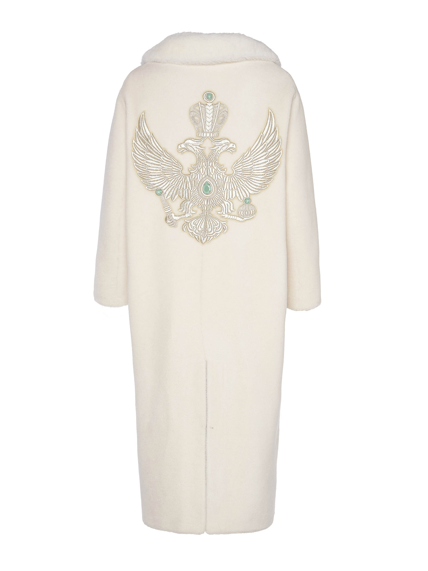 Двуглавый орел на шубе вышит золотыми нитями, в которых содержится 6% белого золота. Кроме того, здесь аутентичная старинная техника шитья органично сочетается с инкрустацией современными камнями Swarovski. Такая комбинация делает изделие неповторимым и превращает его в роскошный символ царского наследия России.