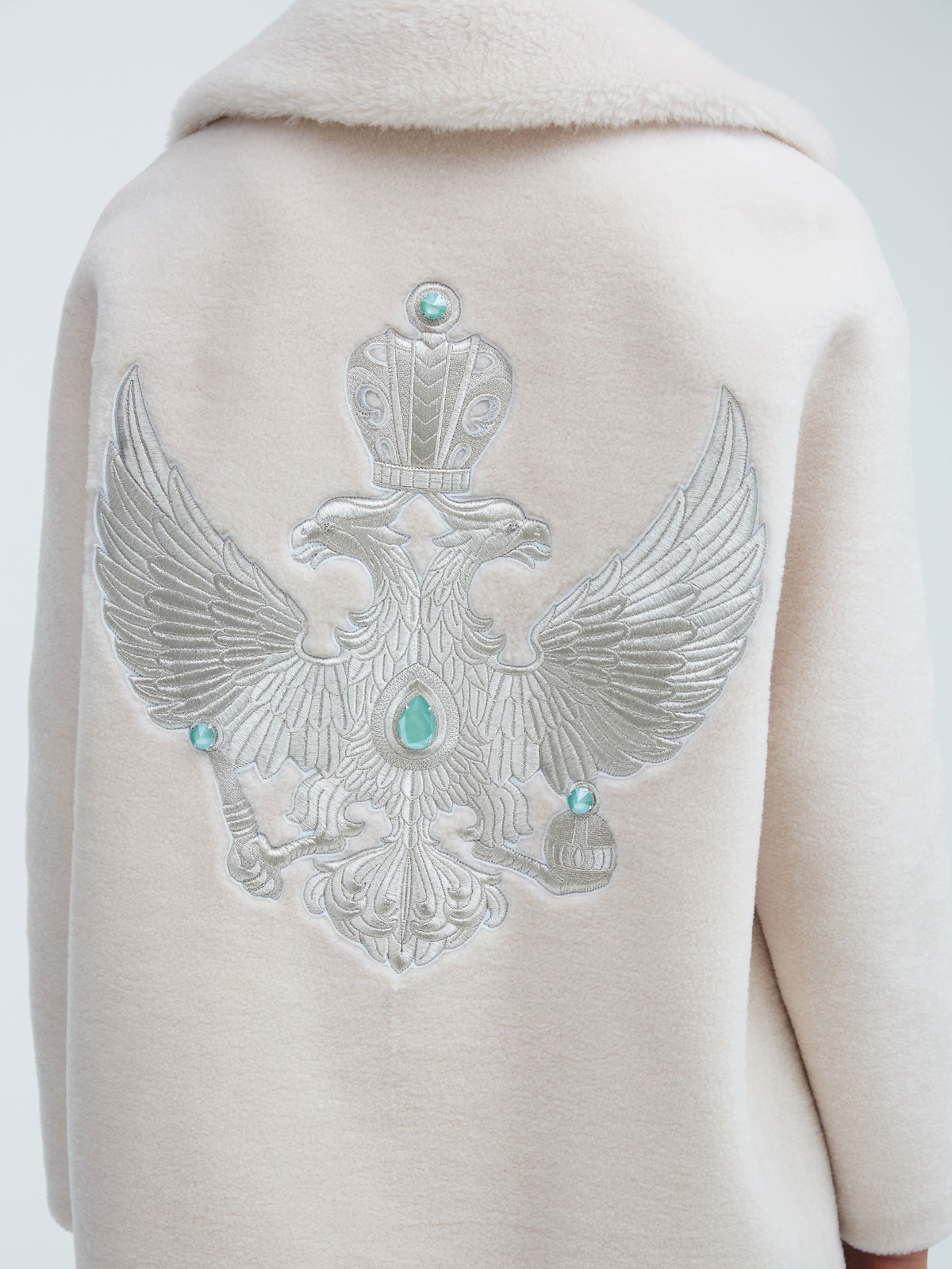 Укороченная шуба из 100% шерсти с двуглавым орлом, вышитым нитями из белого золота – одно из самых роскошных изделий в коллекции. Это исключительное сочетание современных трендов, высоких технологий, эксклюзивного дизайна в русском стиле и исконно русских промыслов, которые воплотились в актуальной и свежей интерпретации. Экомех на этой модели невероятно мягкий и пластичный, поэтому идеально садится по фигуре.