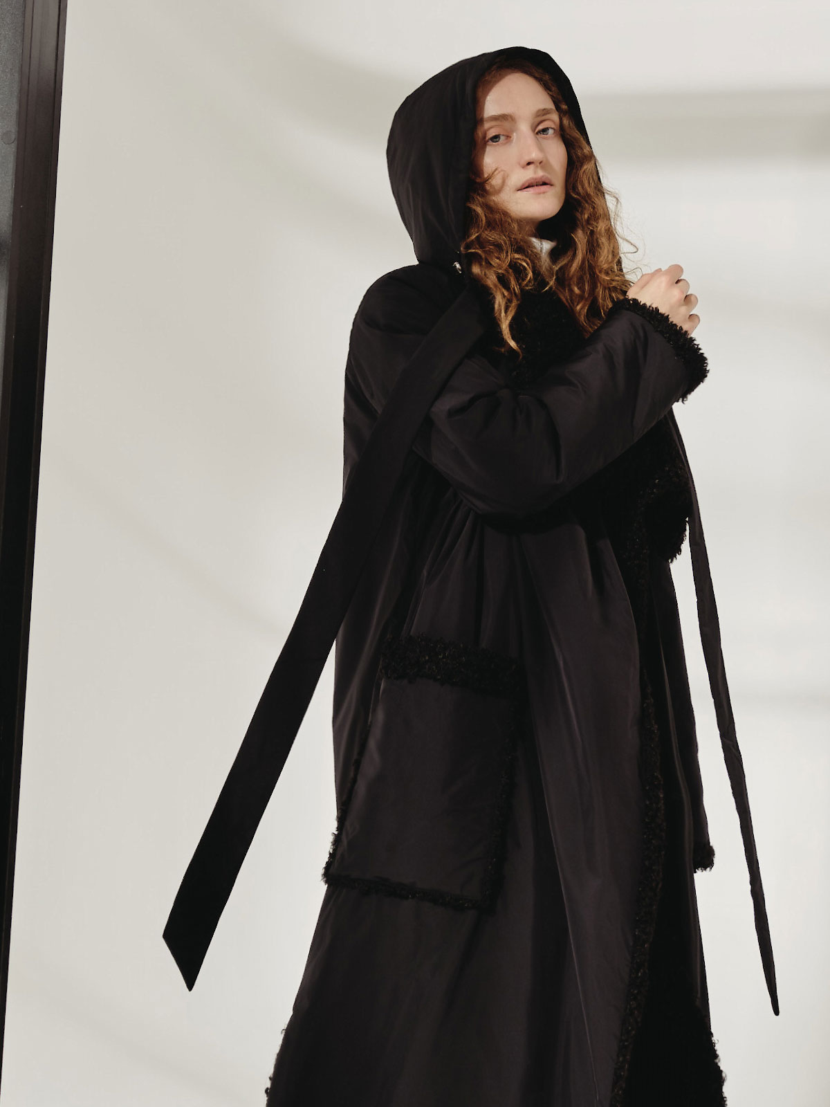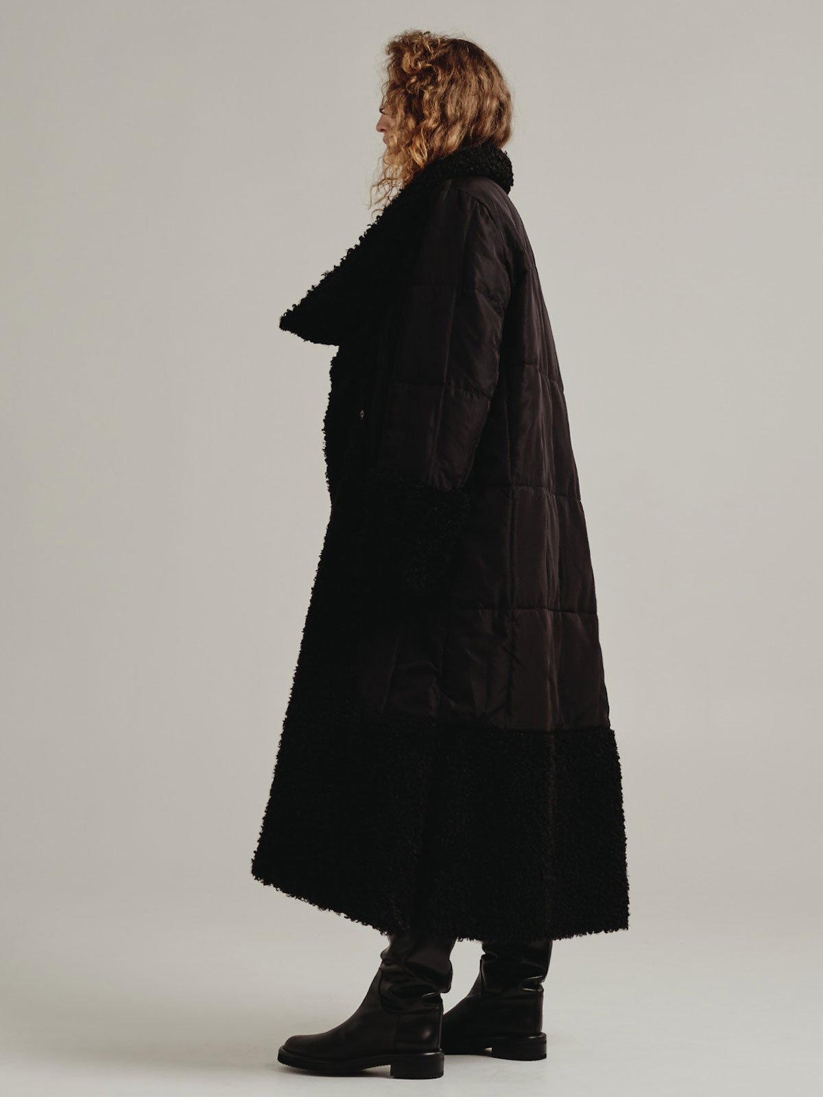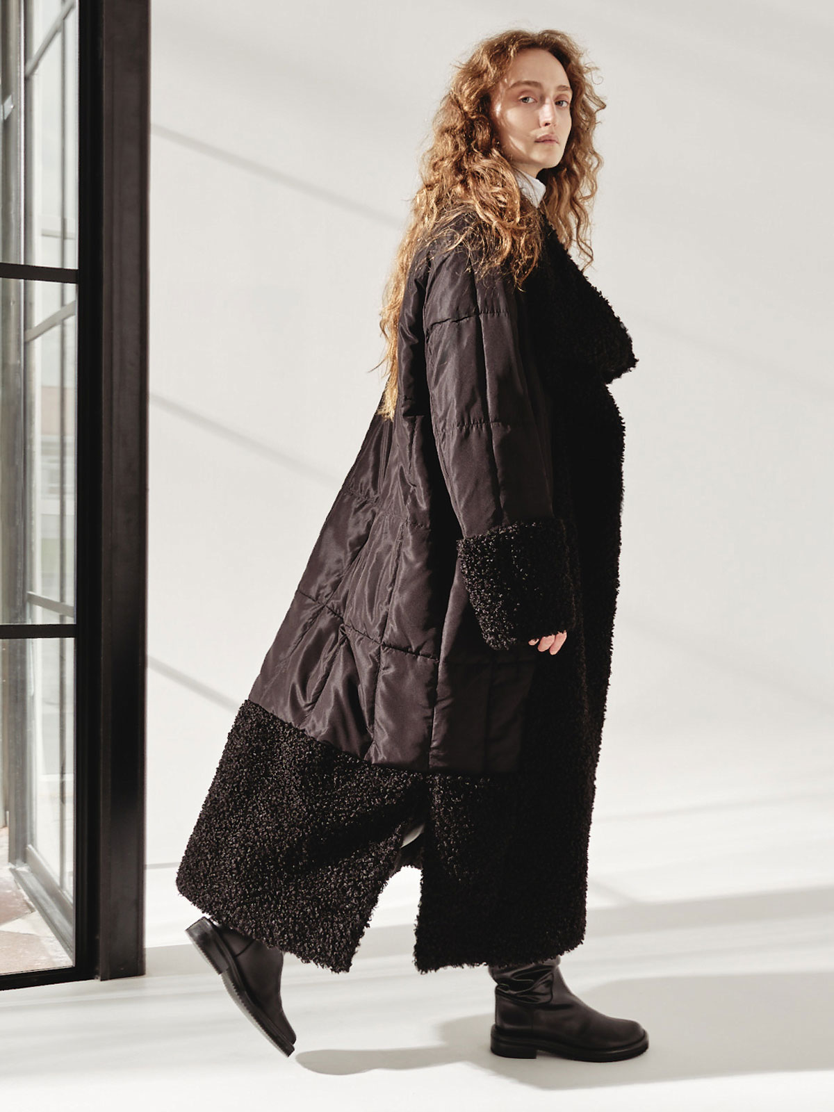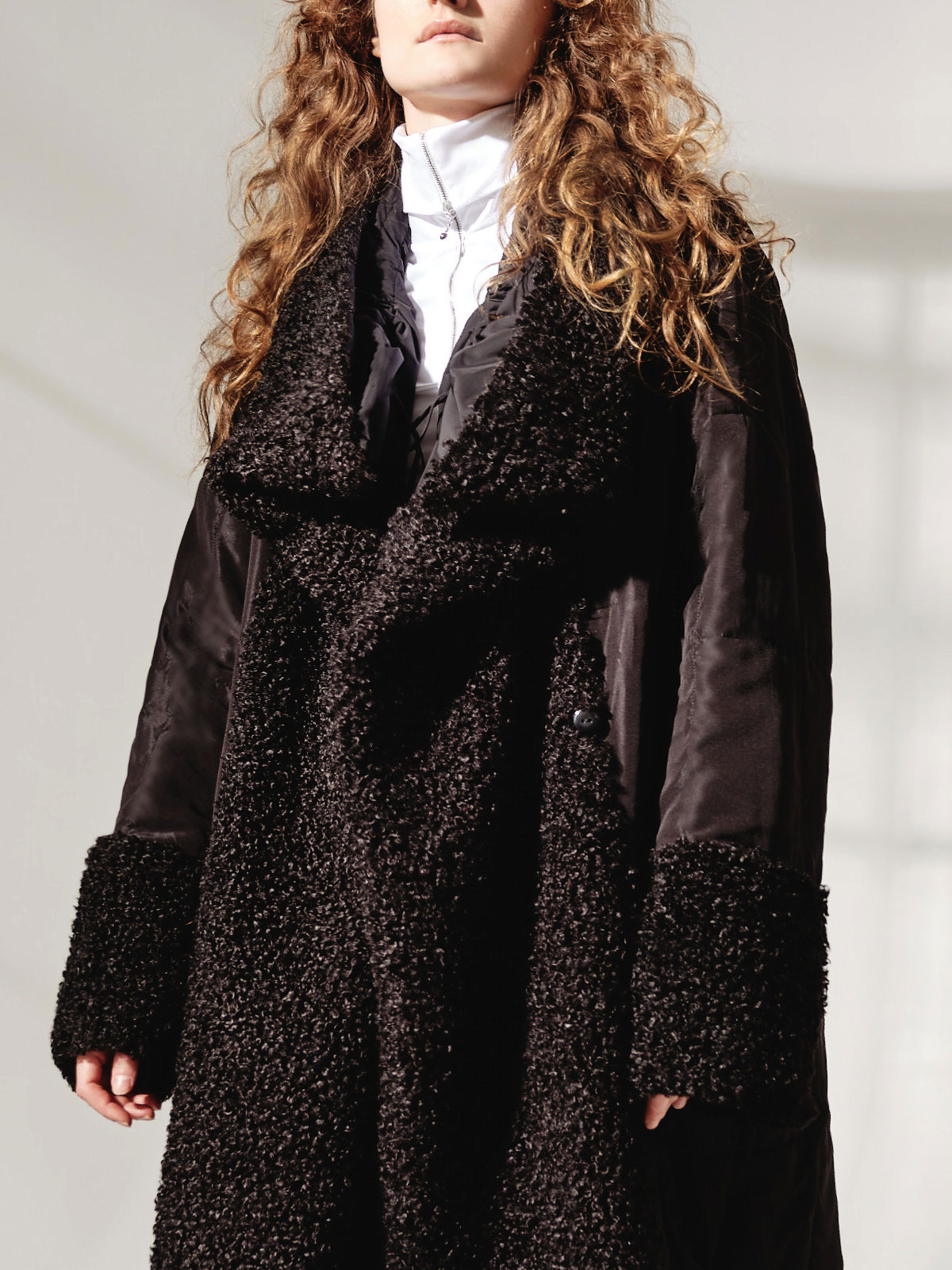 Произведение «Тулуп» премиальной коллекции Romanoff – творческая интерпретация исконно-русского тулупа. Изделие выполнено как пуховое пальто в темном цвете и обрамлено черным экомехом с длинным ворсом из овчины в воротниковой зоне.