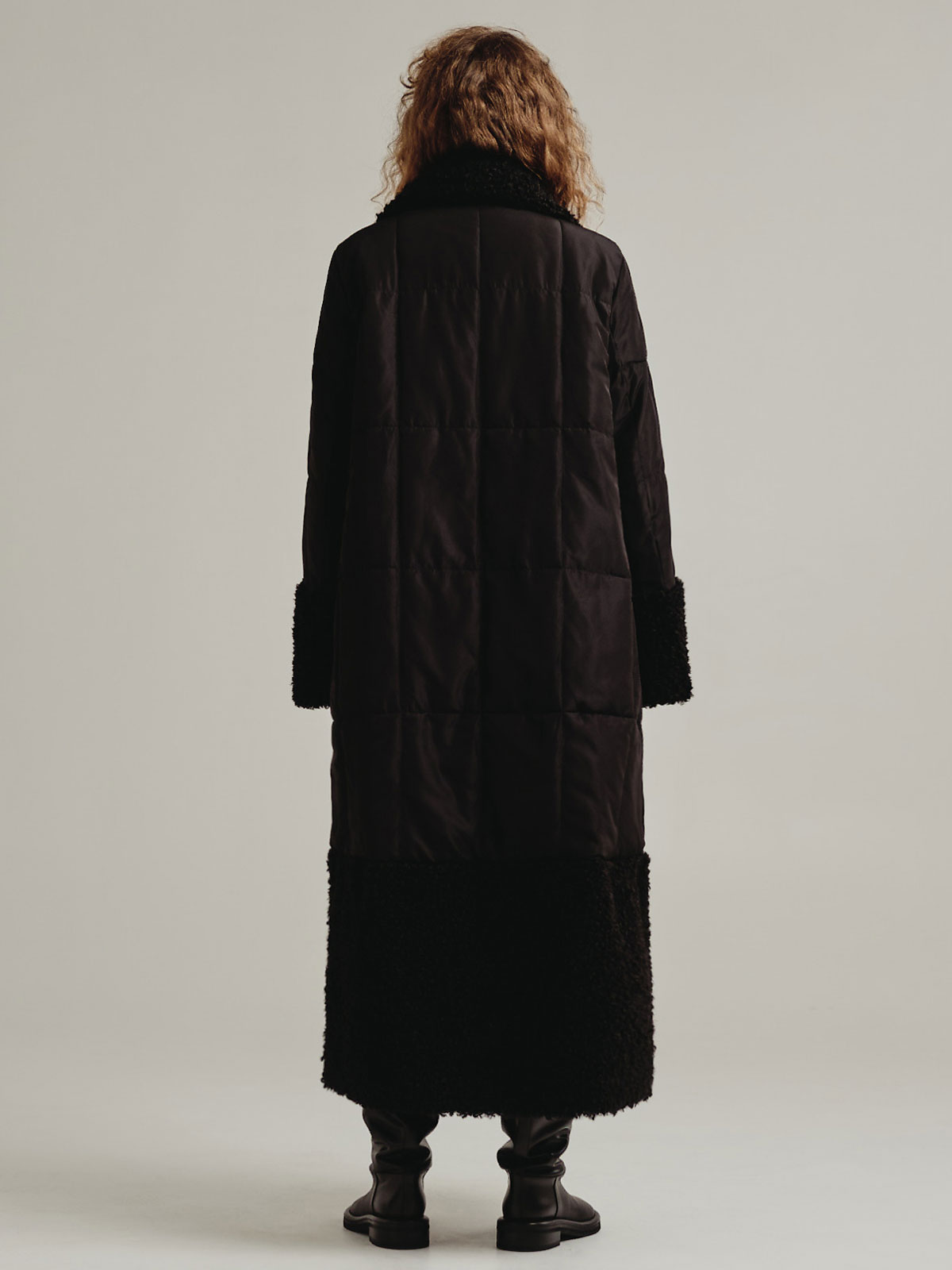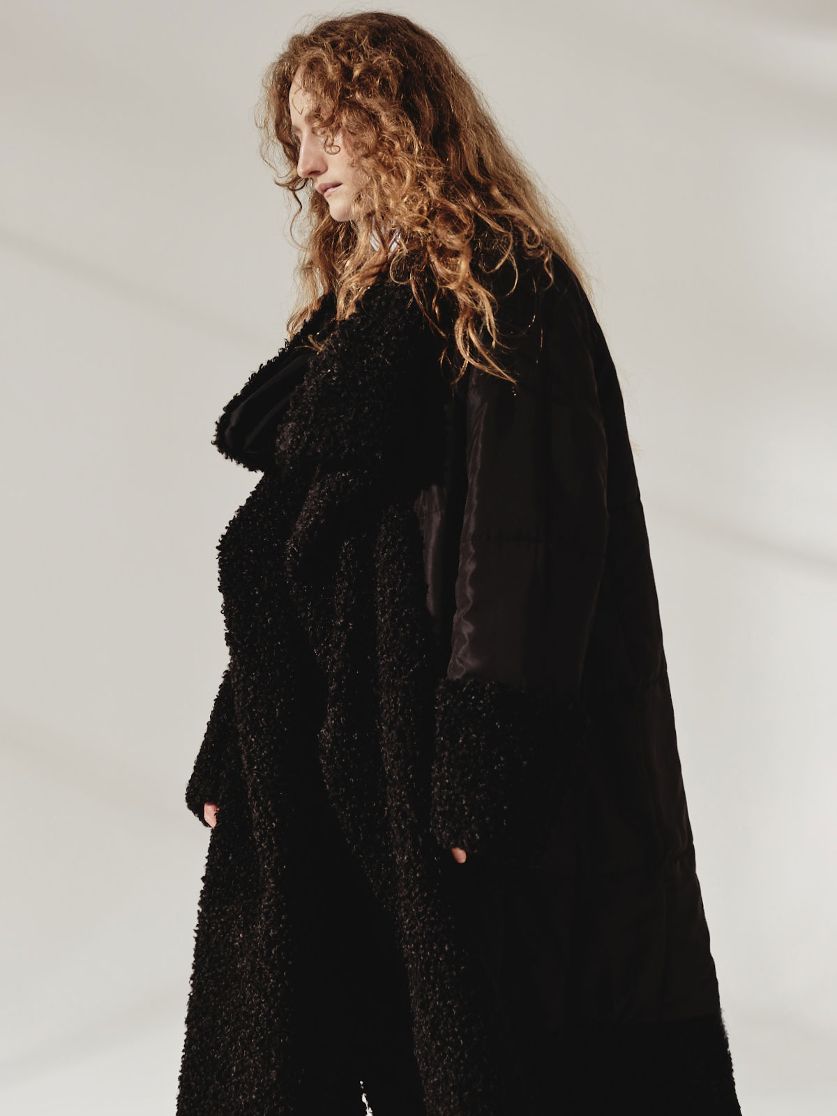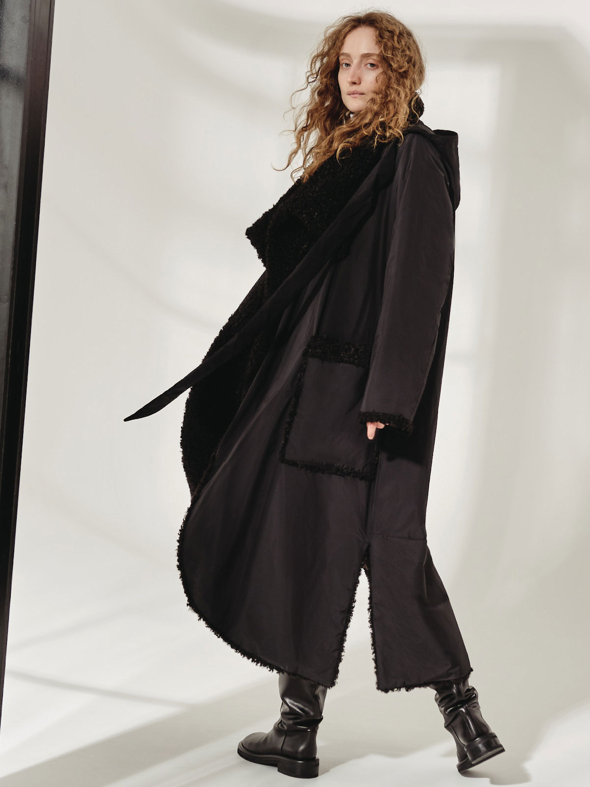 Произведение «Тулуп» премиальной коллекции Romanoff – творческая интерпретация исконно-русского тулупа. Изделие выполнено как пуховое пальто в темном цвете и обрамлено черным экомехом с длинным ворсом из овчины в воротниковой зоне.