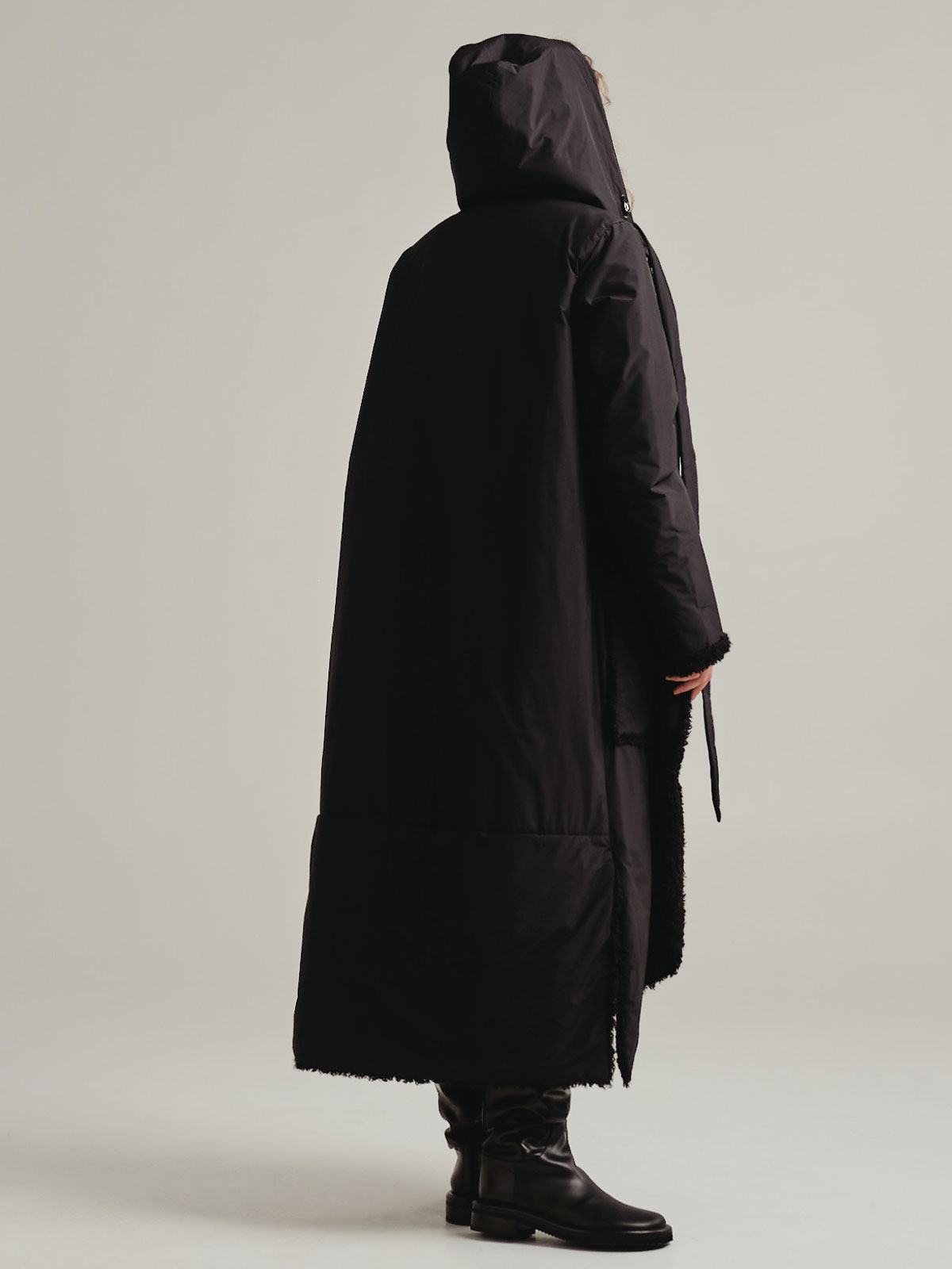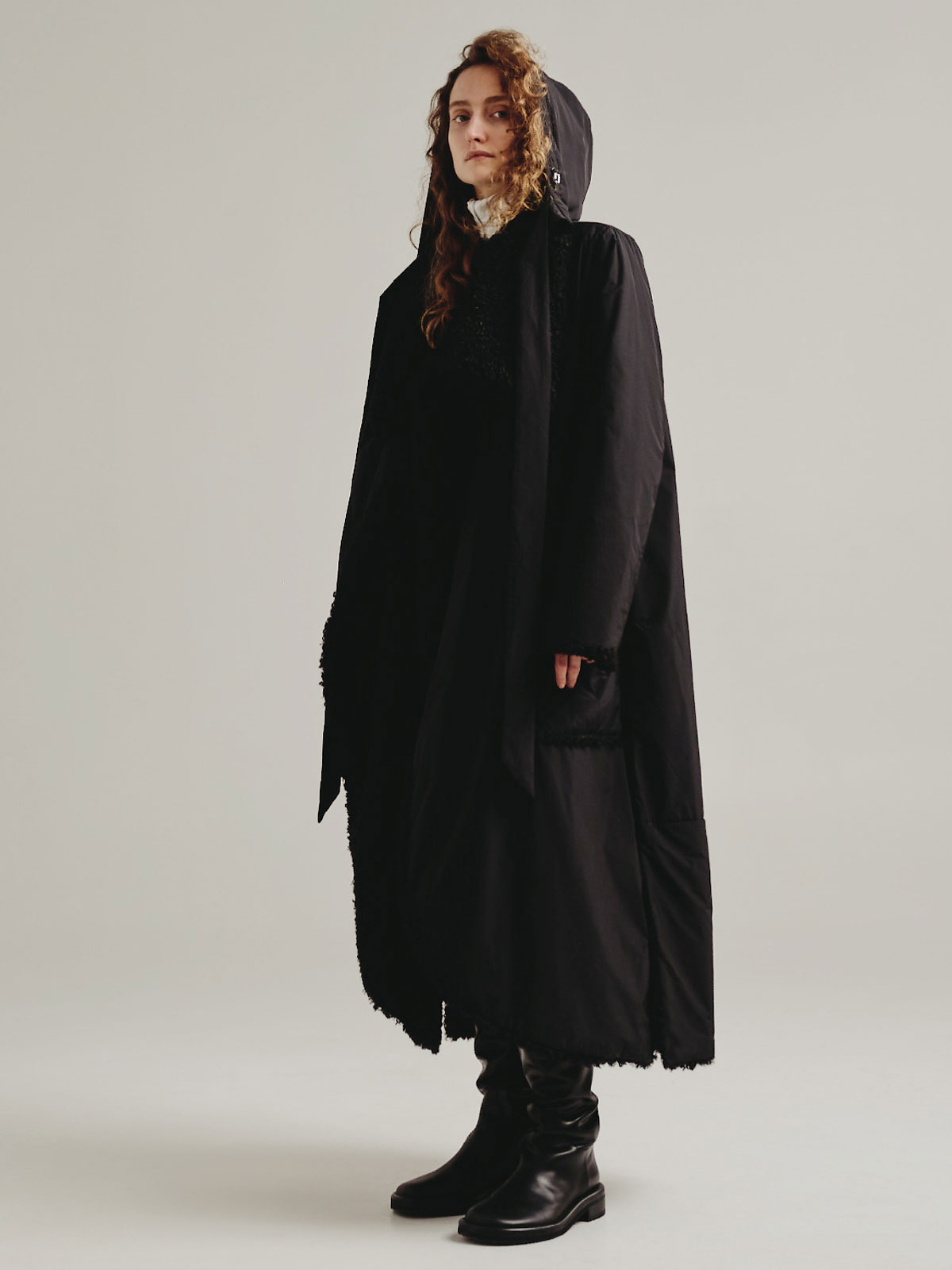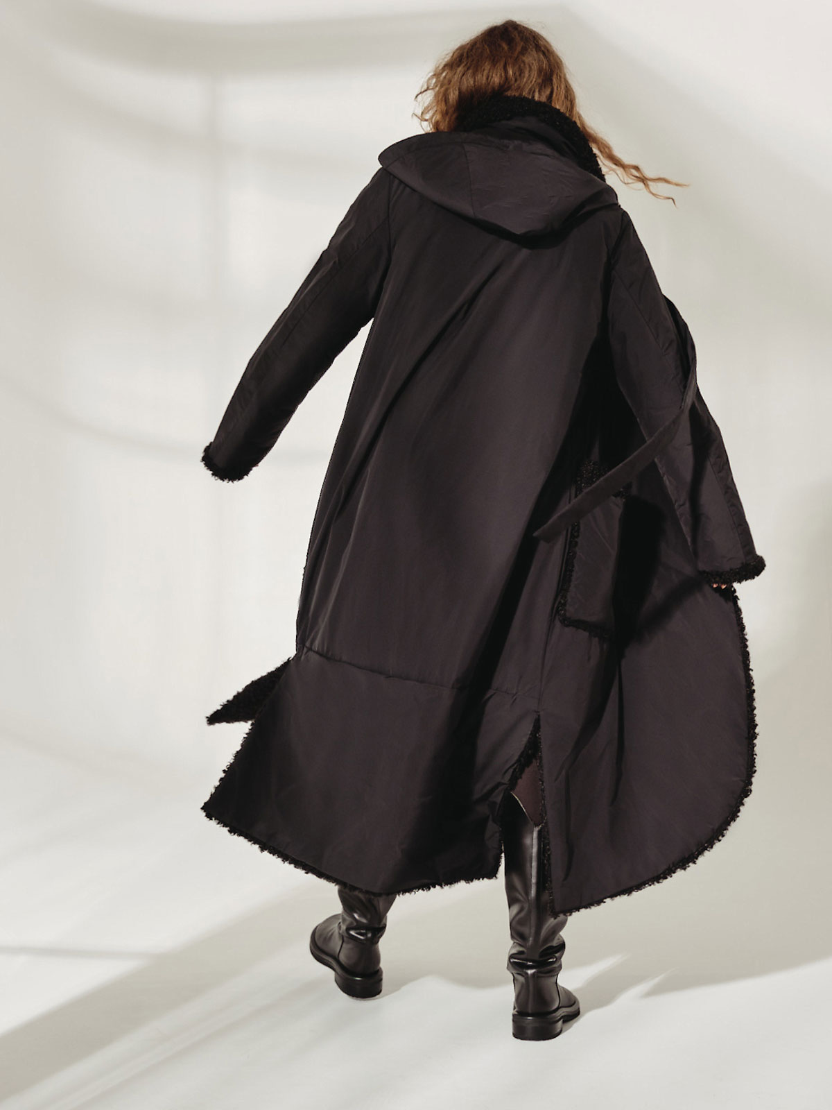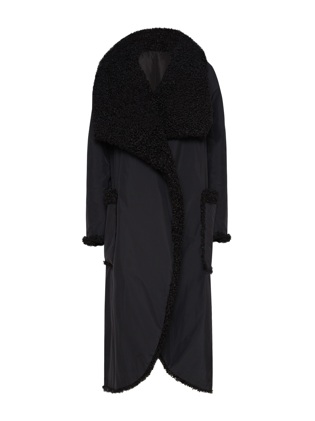 Произведение «Тулуп» премиальной коллекции Romanoff – творческая интерпретация исконно-русского тулупа. Изделие выполнено как пуховое пальто в темном цвете и обрамлено черным экомехом с длинным ворсом из овчины в воротниковой зоне.