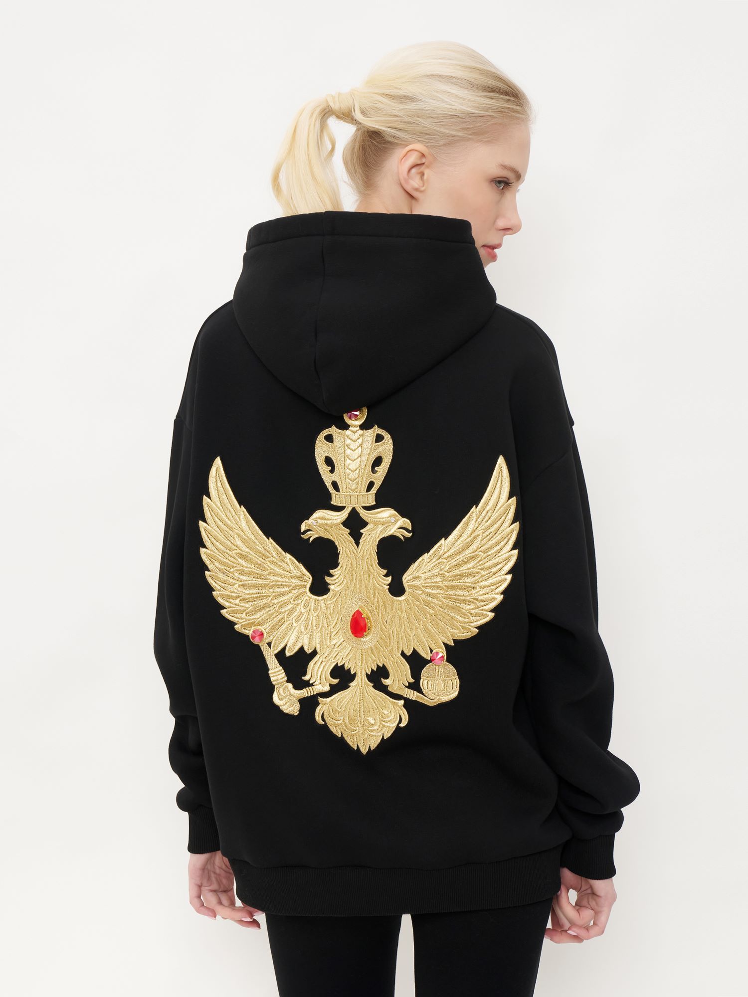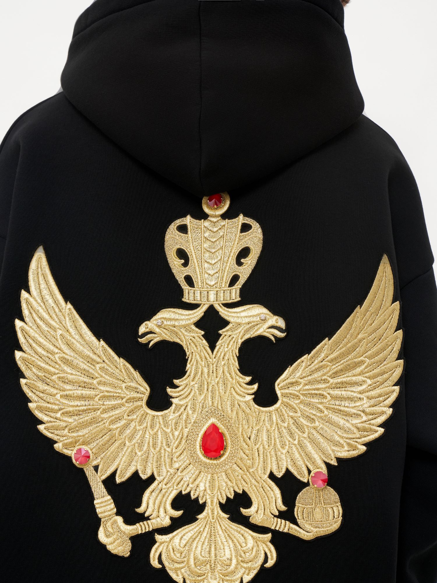 Лимитированное худи является продолжением коллекции, посвященной России и ее главным образам и символам. Двуглавый орел вышит золотыми нитями старинной техникой «в прикреп» торжокскими золотошвеями. Уникальное сочетание спортивного худи и премиальной ручной вышивки делает изделие абсолютно эксклюзивным и соответствует последним тенденциям мировой модной индустрии на смешение стилей и эклектику. Благодаря универсальному дизайну худи одинаково подходит как женщинам, так и мужчинам.