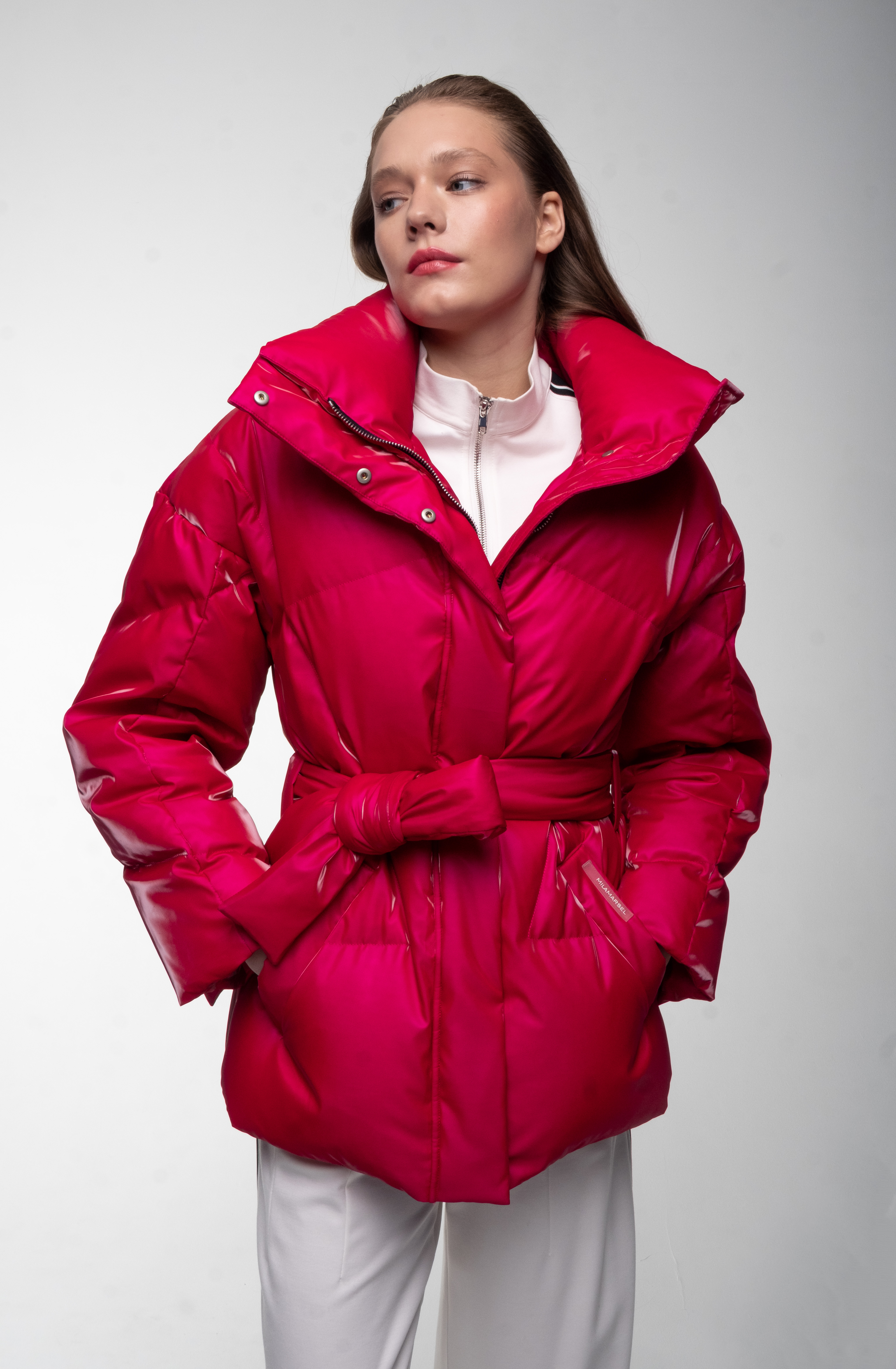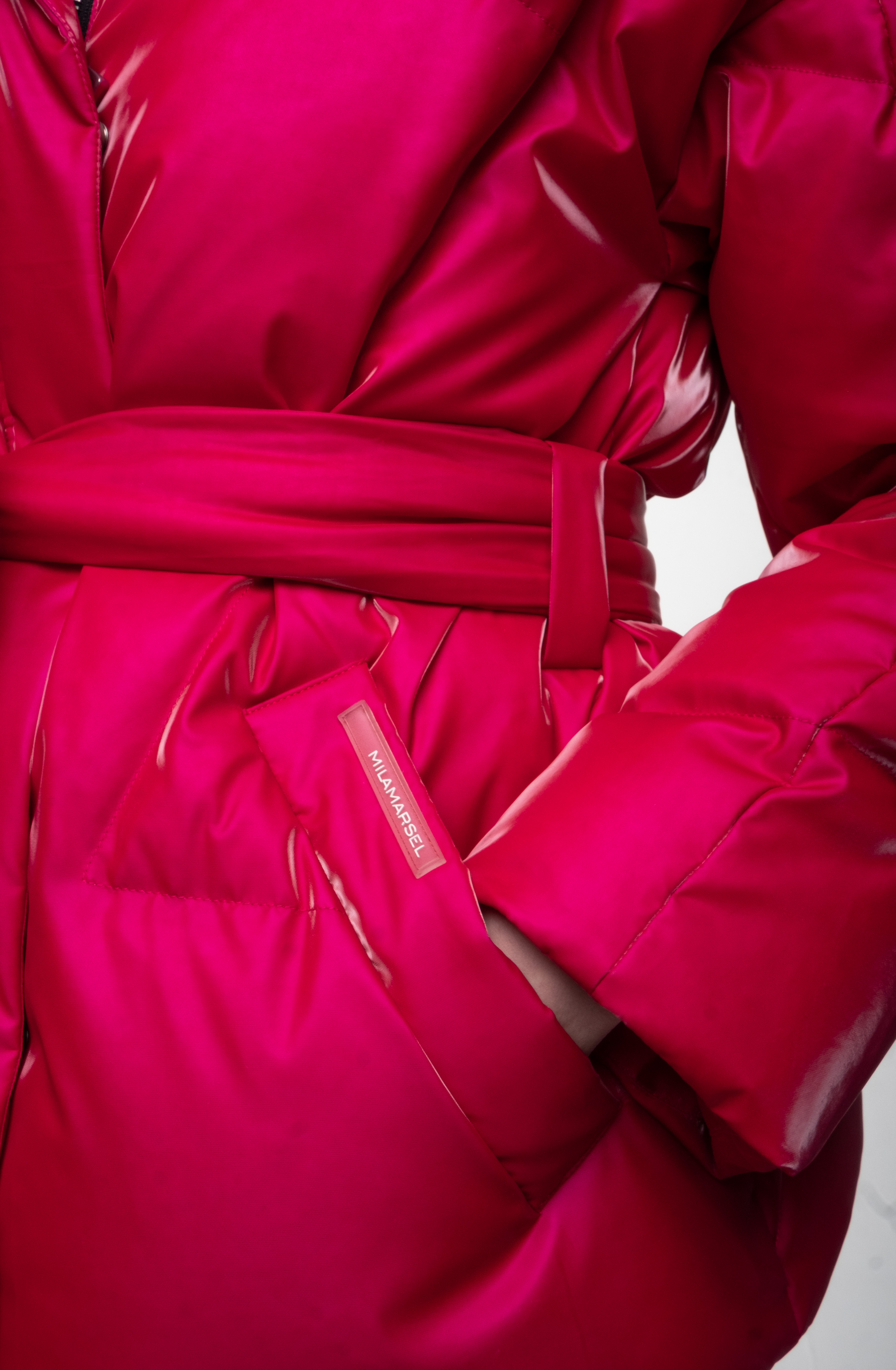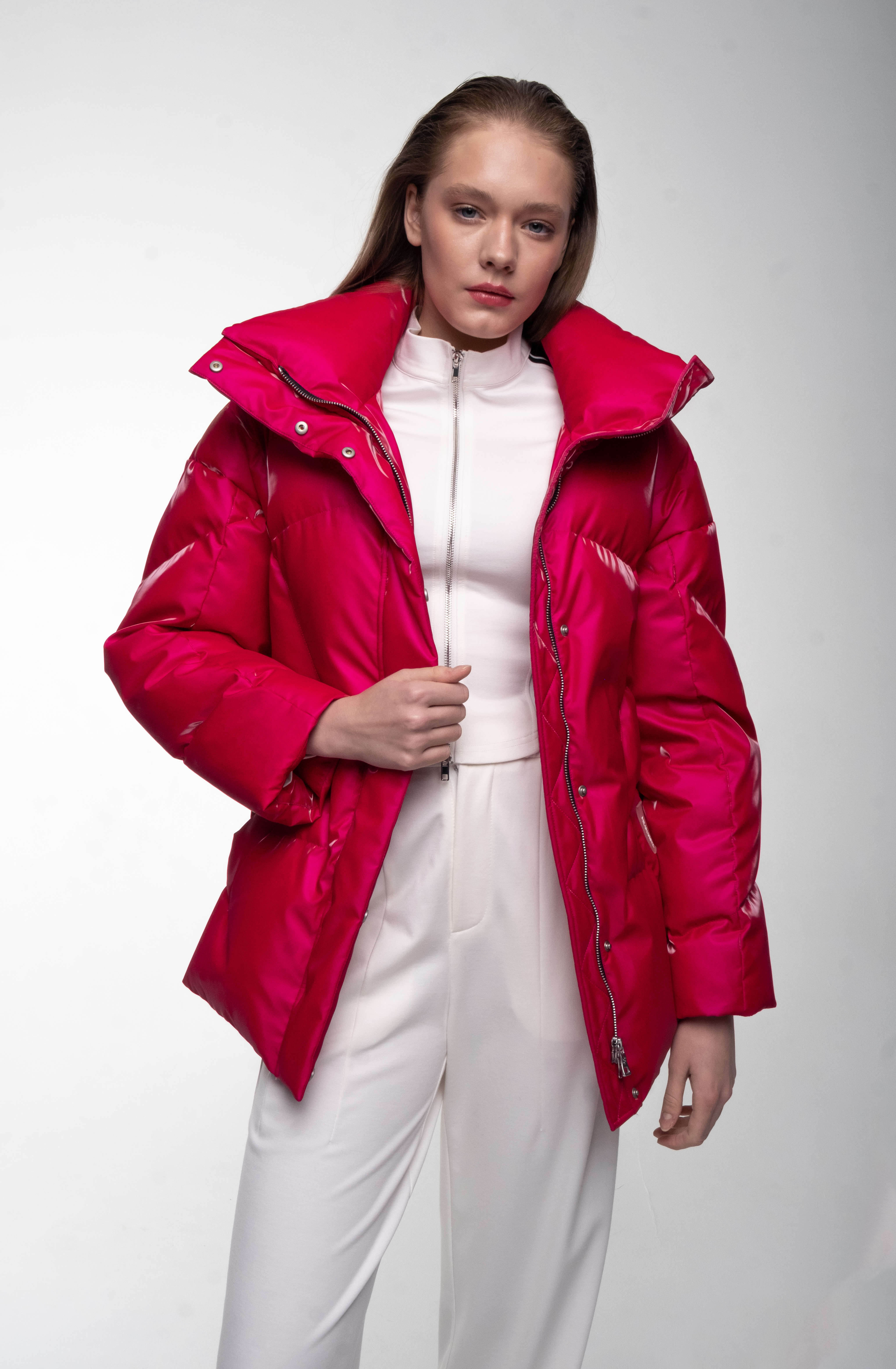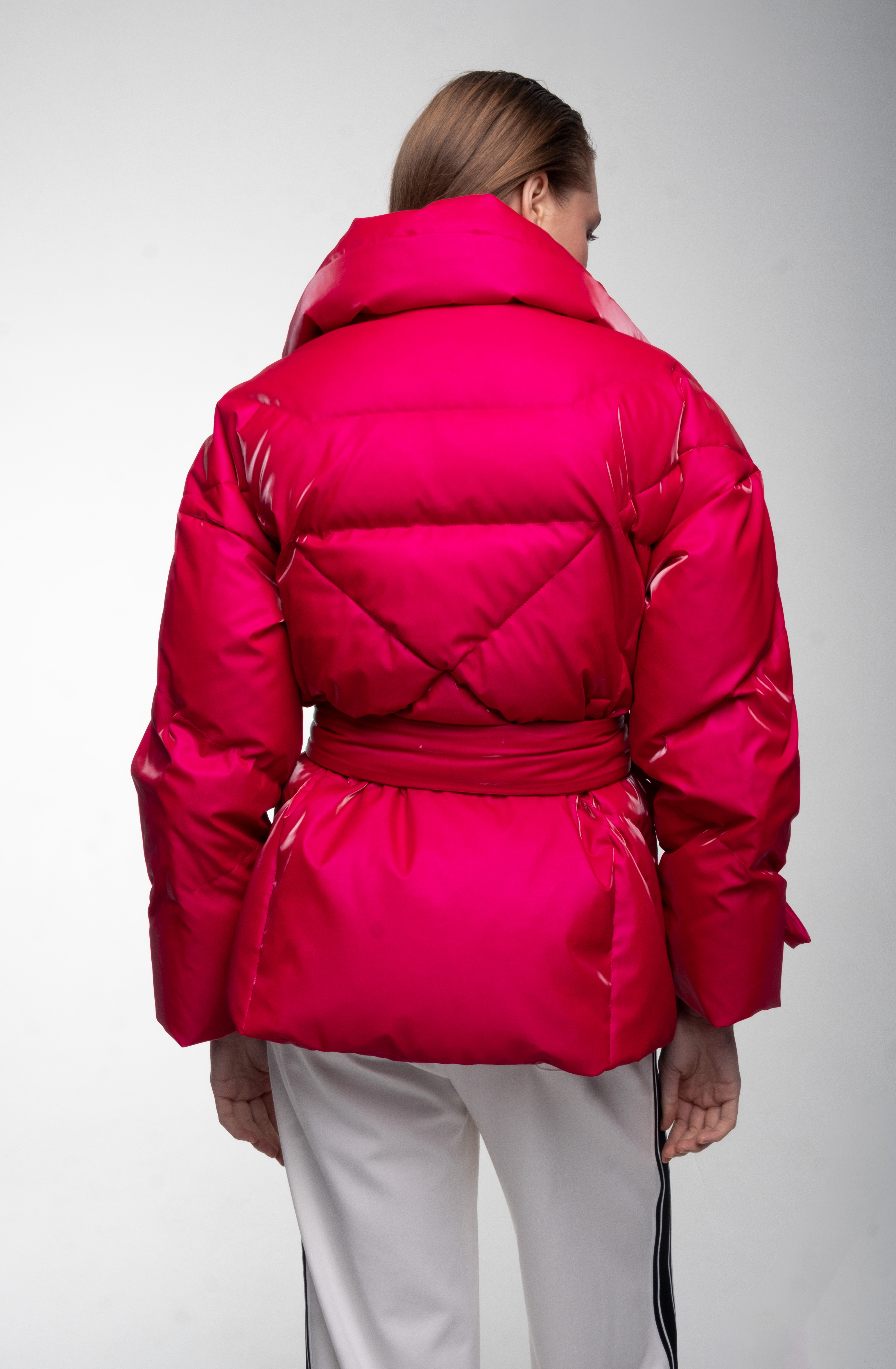 Яркий розовый пуховик.