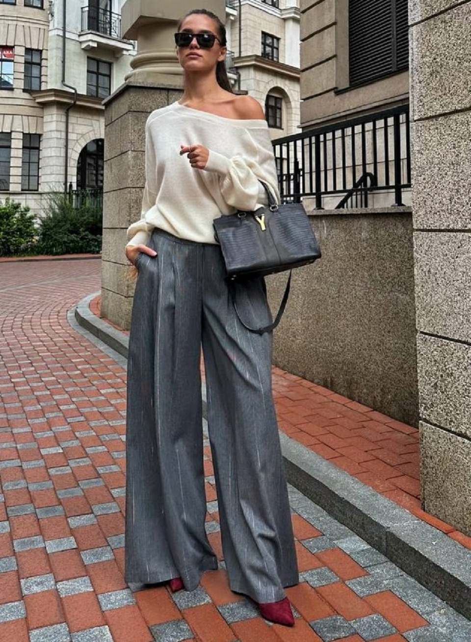 Широкие брюки создают эффектный силуэт, подчеркивая женственность и утонченность обладательницы. Серый цвет придает изделию особую изысканность и элегантность, а легкий блеск шёлка добавляет некоторую нотку гламура.