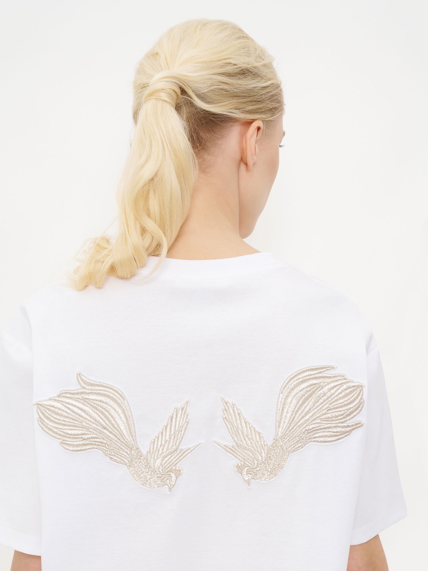 Авторский принт «Птицы» вышит золотыми нитями старинной техникой «в прикреп» торжокскими золотошвеями.
