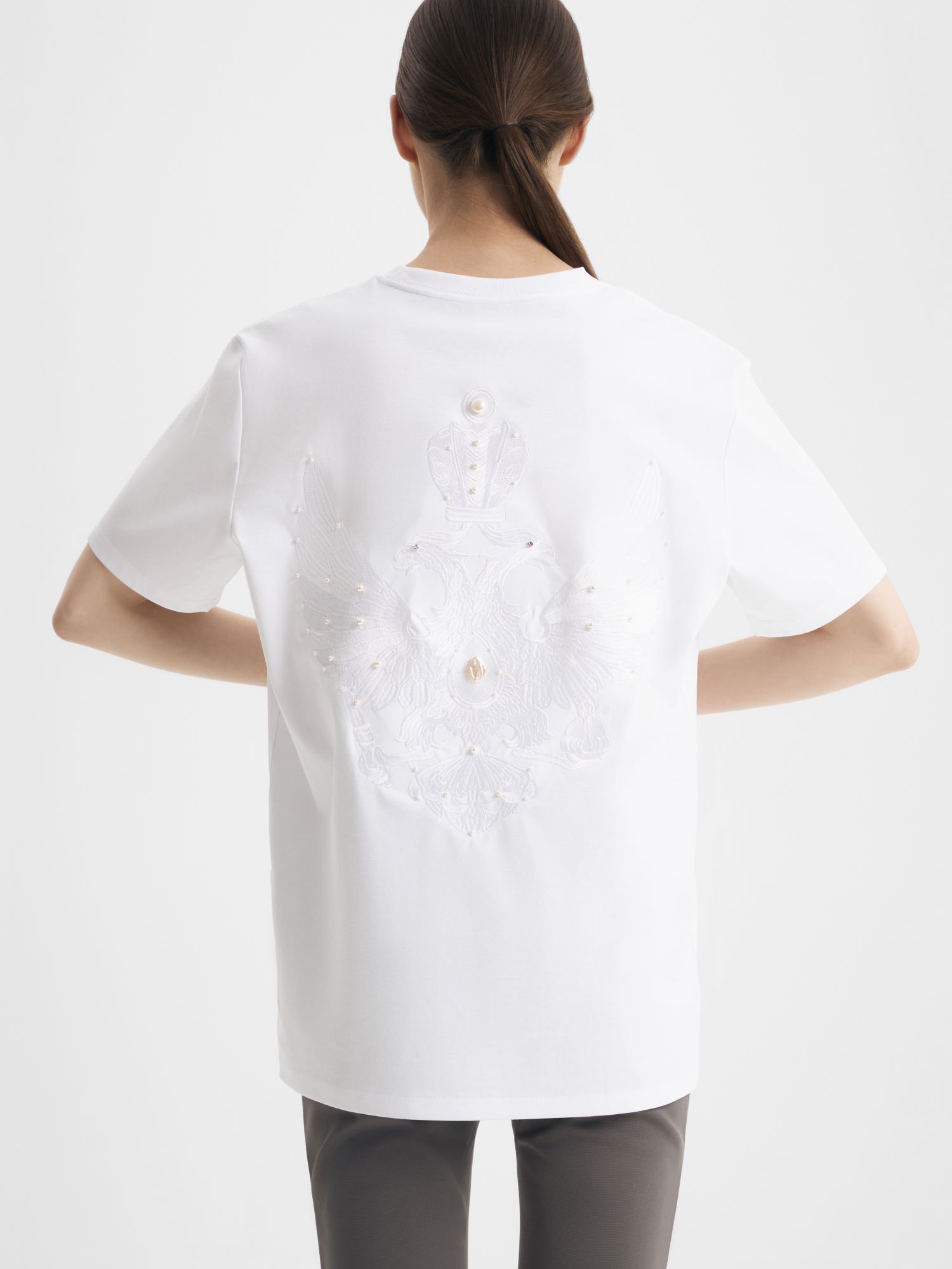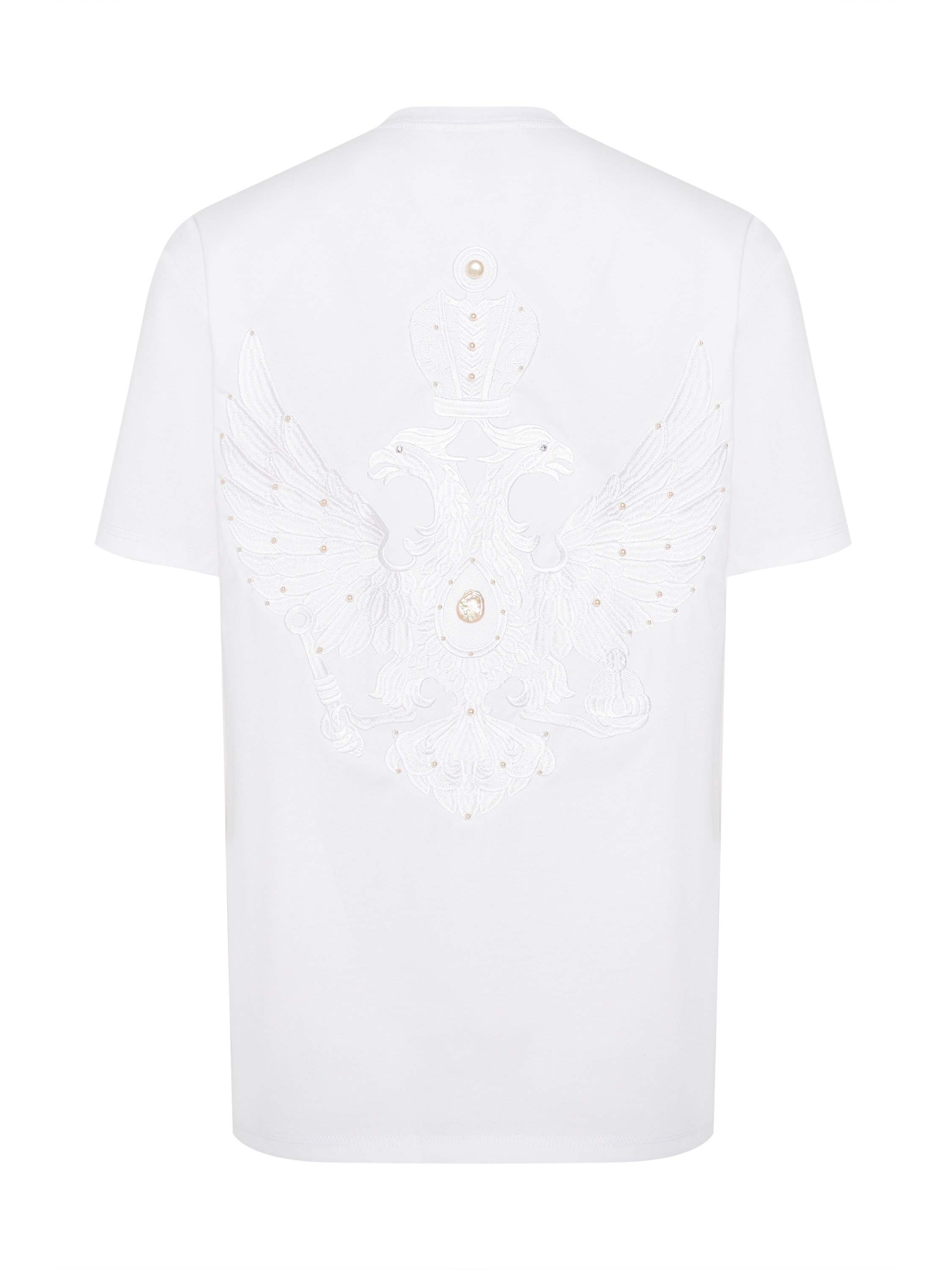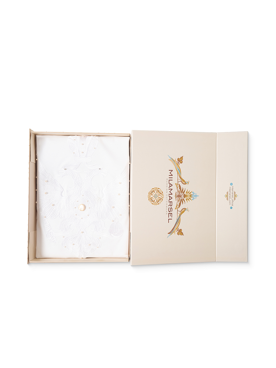 Двуглавый царский орел, вышитый ниткой с позолотой и кристаллами, добавляет изделию ещё больше величия и эксклюзивности. Эта вышивка выполнена в старинной технике «в прикреп» торжокскими золотошвеями, что подчеркивает уникальность и высокое качество изделия.