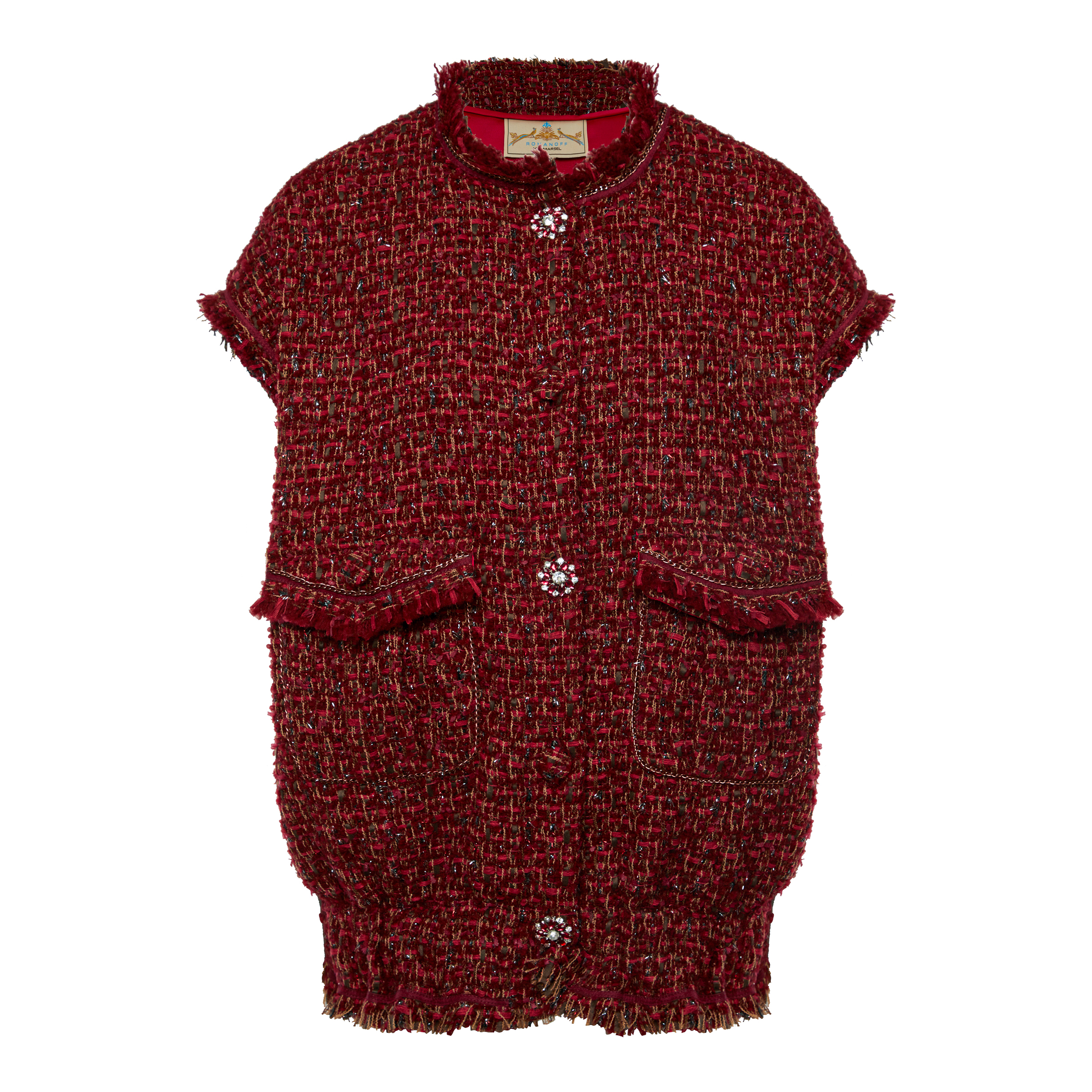 - Жакет "Лима" — это яркое воплощение элегантности и неповторимого стиля. Изготовленный из роскошного твида, он мастерски сочетает классические и современные элементы, создавая уникальный образ. Утонченные детали и укороченные рукава добавляют особый шарм, делая жакет настоящим произведением искусства. Контрастные пуговицы выделяются на фоне глубокого красного цвета, подчеркивая вашу индивидуальность и уверенность.