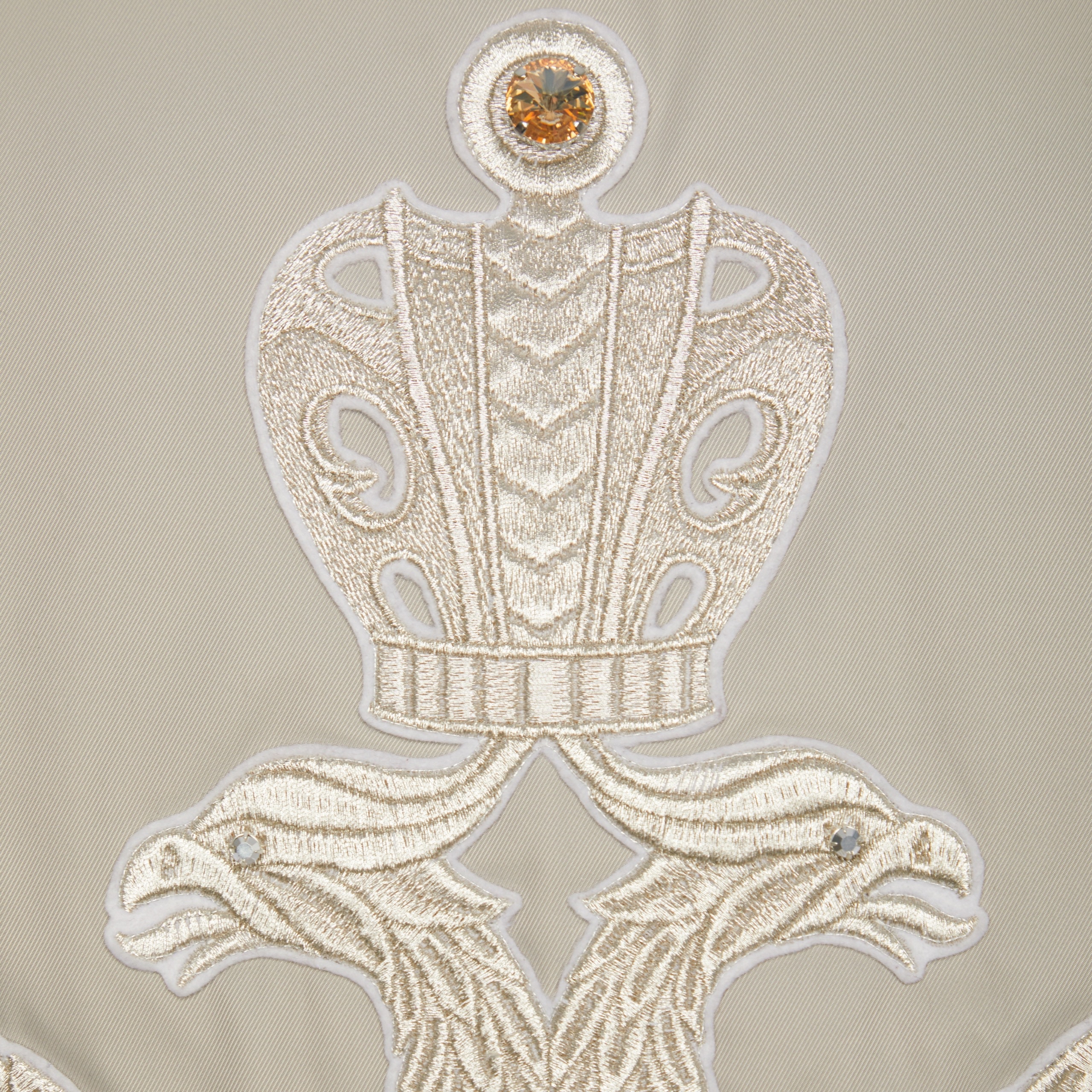 Эффектный жакет с высокой горловиной и прямым кроем. На спине — изысканная вышивка в виде двуглавого орла с декоративными элементами, подчеркивающая роскошь и уникальность модели. Мягкий блеск ткани из вискозы и шёлка делает образ утончённым и выразительным.